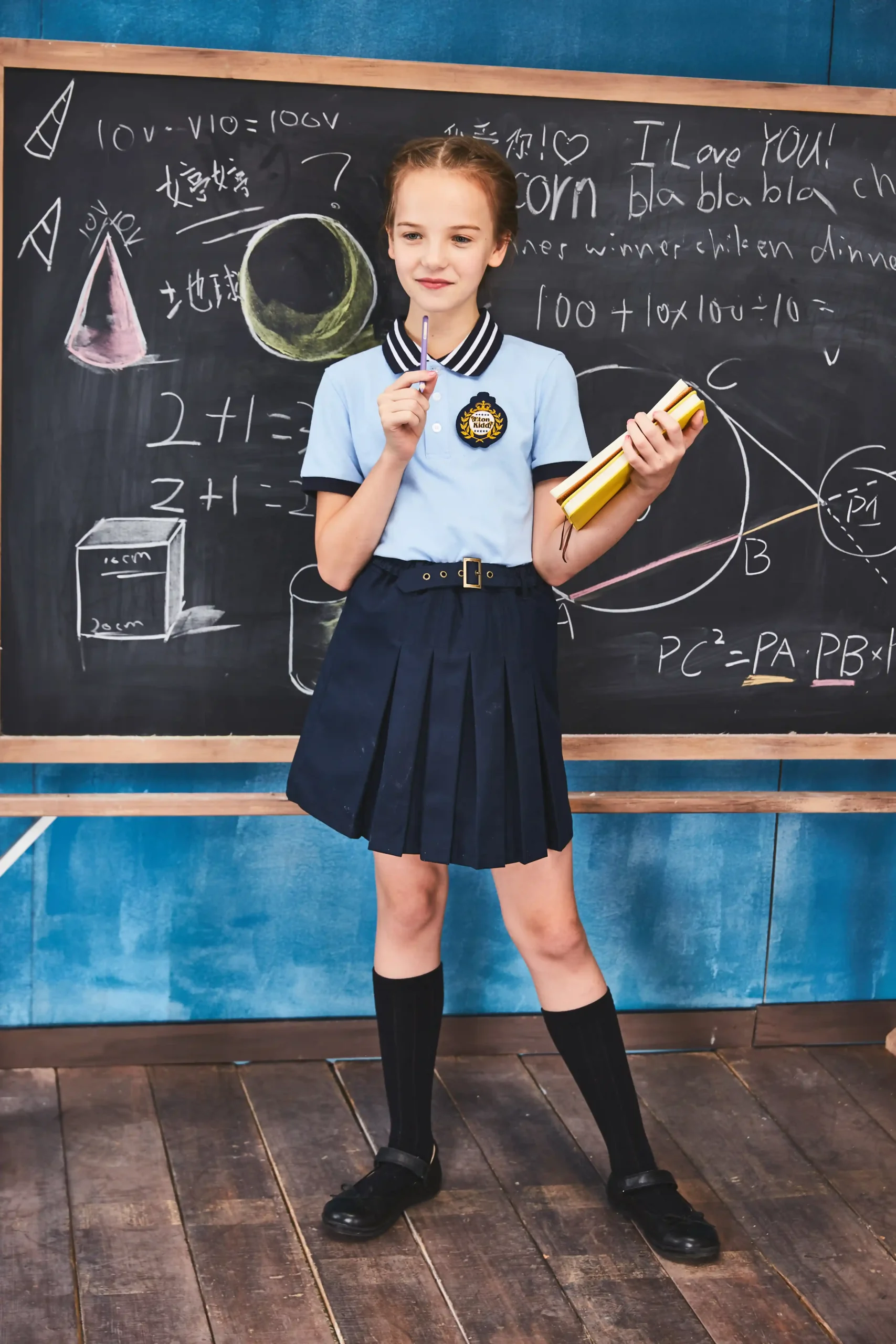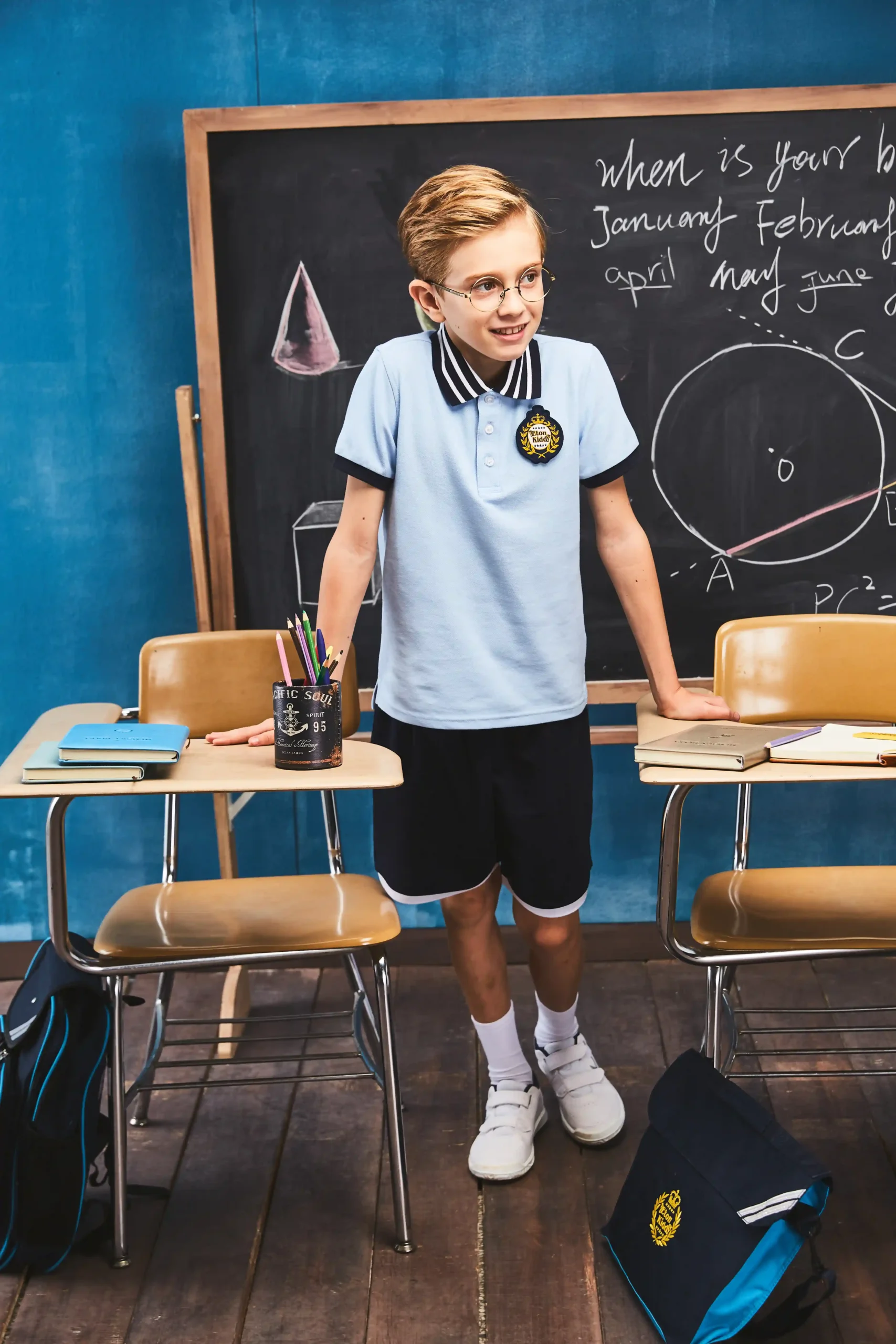 The design details emphasize a careful balance between collegiate charm and functional wear. The ribbed collar with nautical stripes introduces a refreshing visual element that recalls both preppy and maritime influences. A classic three-button placket enhances versatility, allowing the neckline to be styled open or closed depending on the occasion. Branded engraved round buttons on the placket add a subtle yet distinctive touch, signaling attention to detail and quality. Ribbed cuffs are designed for comfort, sitting securely on the arms without tightness, ensuring all-day ease. Vented side slits at the hem improve mobility and contribute to the shirt’s shape retention, preventing distortion during active movement. A neatly finished hem with cover-stitching enhances durability while maintaining a clean, refined appearance. Inside, a garment hangtag and care label offer both a professional finish and practical guidance, underscoring the thoughtful craftsmanship behind the garment. Every element of the design contributes to a polished, collegiate-inspired look that is versatile for multiple contexts.