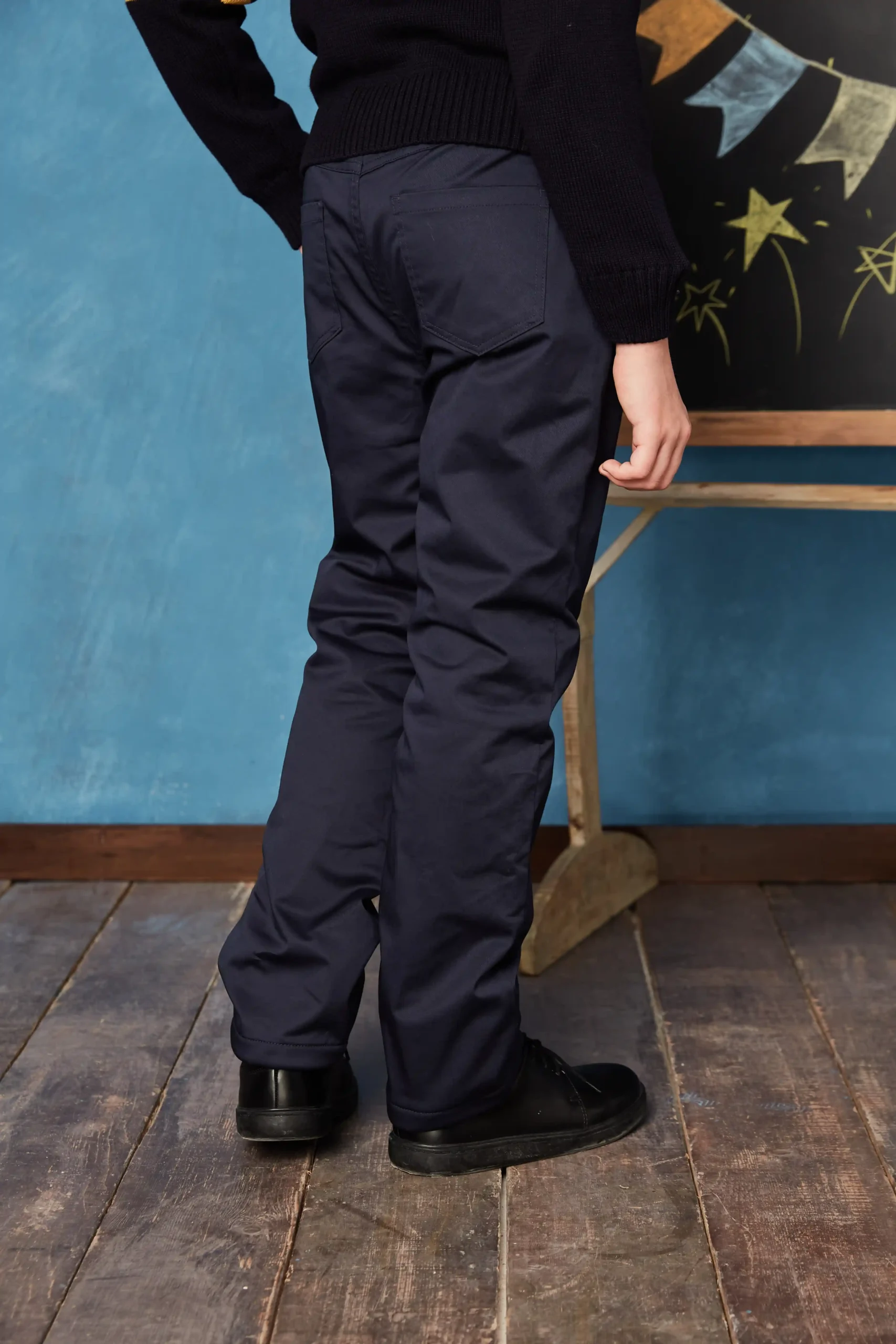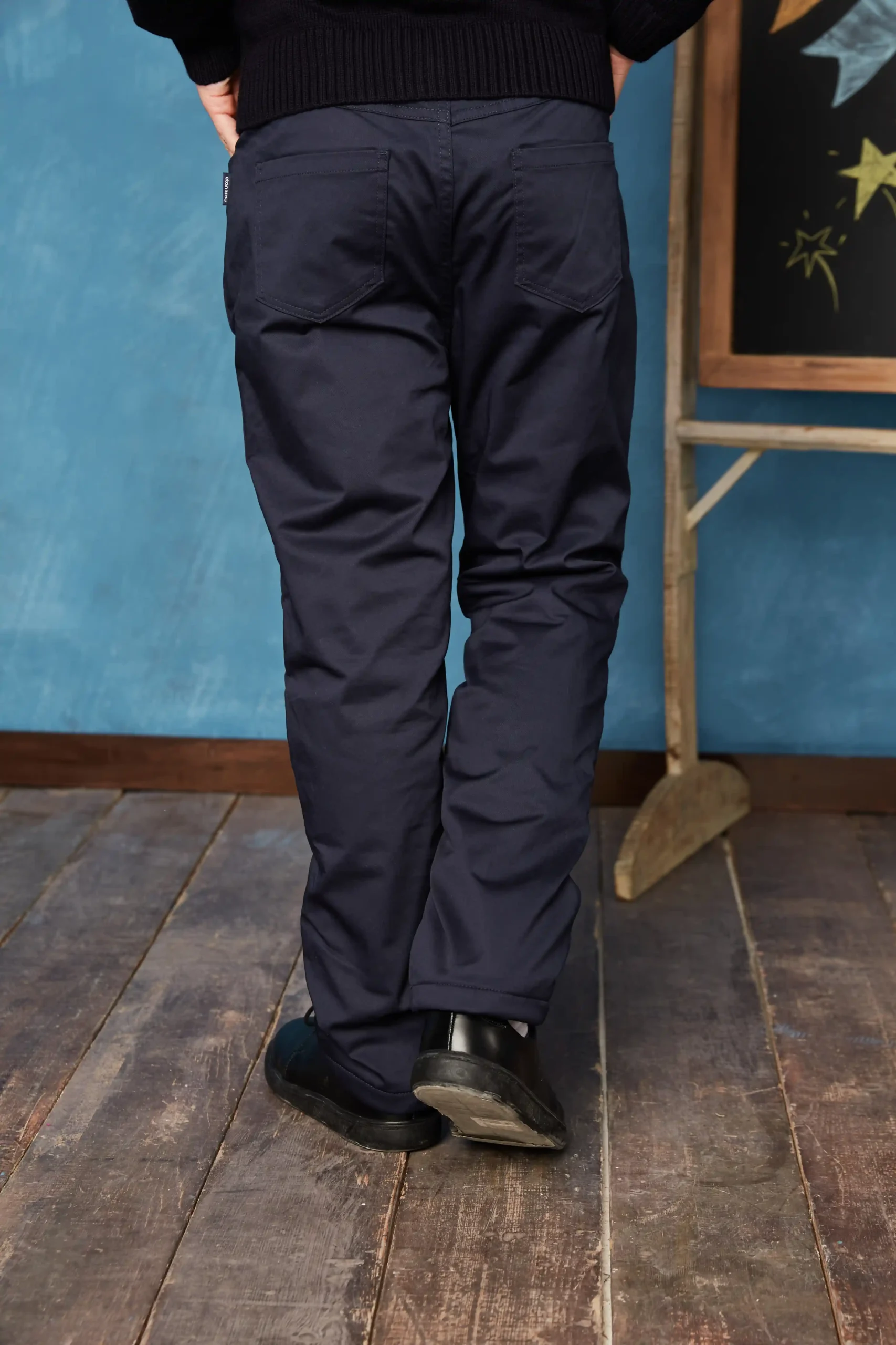 Every aspect of these pants has been thoughtfully designed to balance function and aesthetics. The straight-leg cut offers a neat profile, while reinforced bar tacks at stress points enhance durability. Two waist designs are available to accommodate different age groups: for sizes 130 and below, a full elastic waistband ensures easy dressing and flexibility; for sizes 140 and above, a zipper fly with belt loops and adjustable elastic delivers a more structured yet adaptable fit. Brand-engraved I-shaped buttons and decorative topstitching add subtle refinement, highlighting both craftsmanship and identity. Functional slant pockets at the front and a back patch pocket provide practical storage, while the curved finish and clean seams complete the look with attention to detail. Hangtags and care labels underscore the garment’s quality assurance, reinforcing its premium positioning in both schoolwear and casual wardrobes.
