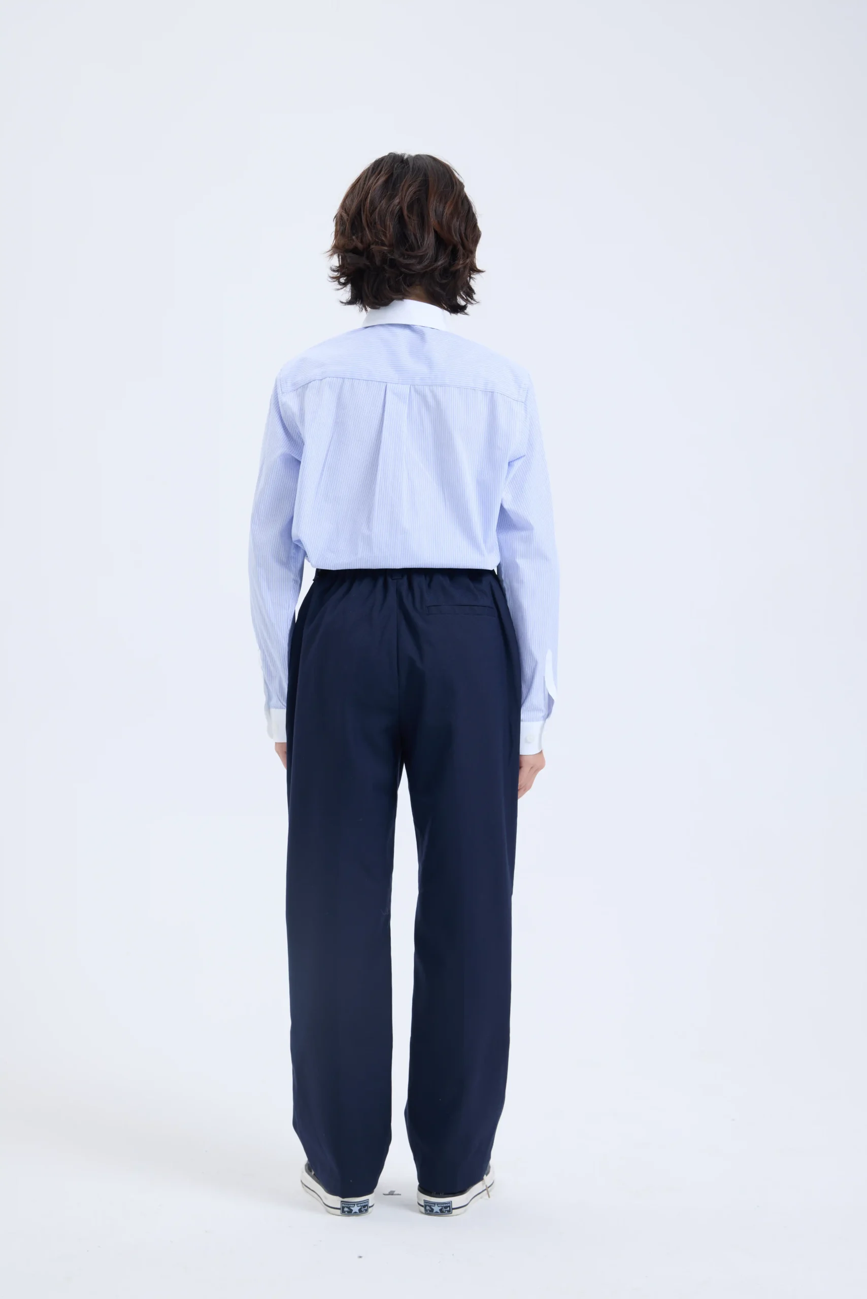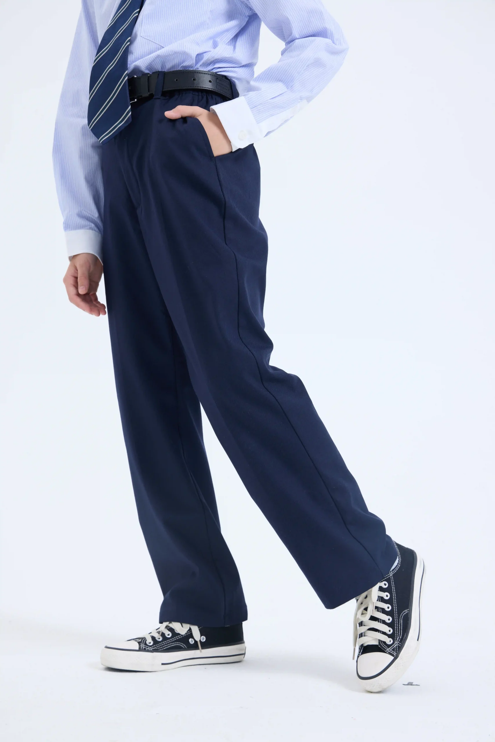 Crafted from high-quality, breathable fabric with slight elasticity, these pants offer a balance between structure and comfort. The material is resistant to wrinkles and retains its shape after repeated wear and washing, reducing the need for constant maintenance. Fine stitching enhances durability and gives the pants a refined, crisp appearance, while subtle reinforcements along stress points prevent deformation over time. The rear waistband incorporates a clean, single-lip design that not only improves fit but also adds visual neatness. The waistband configuration differs according to age group: sizes up to 140 feature a zipper fly with an elastic waistband, while sizes 150 and above incorporate a zipper fly with adjustable elastic for a more tailored fit. These process details ensure that the pants perform well in everyday school activities while maintaining a polished look.