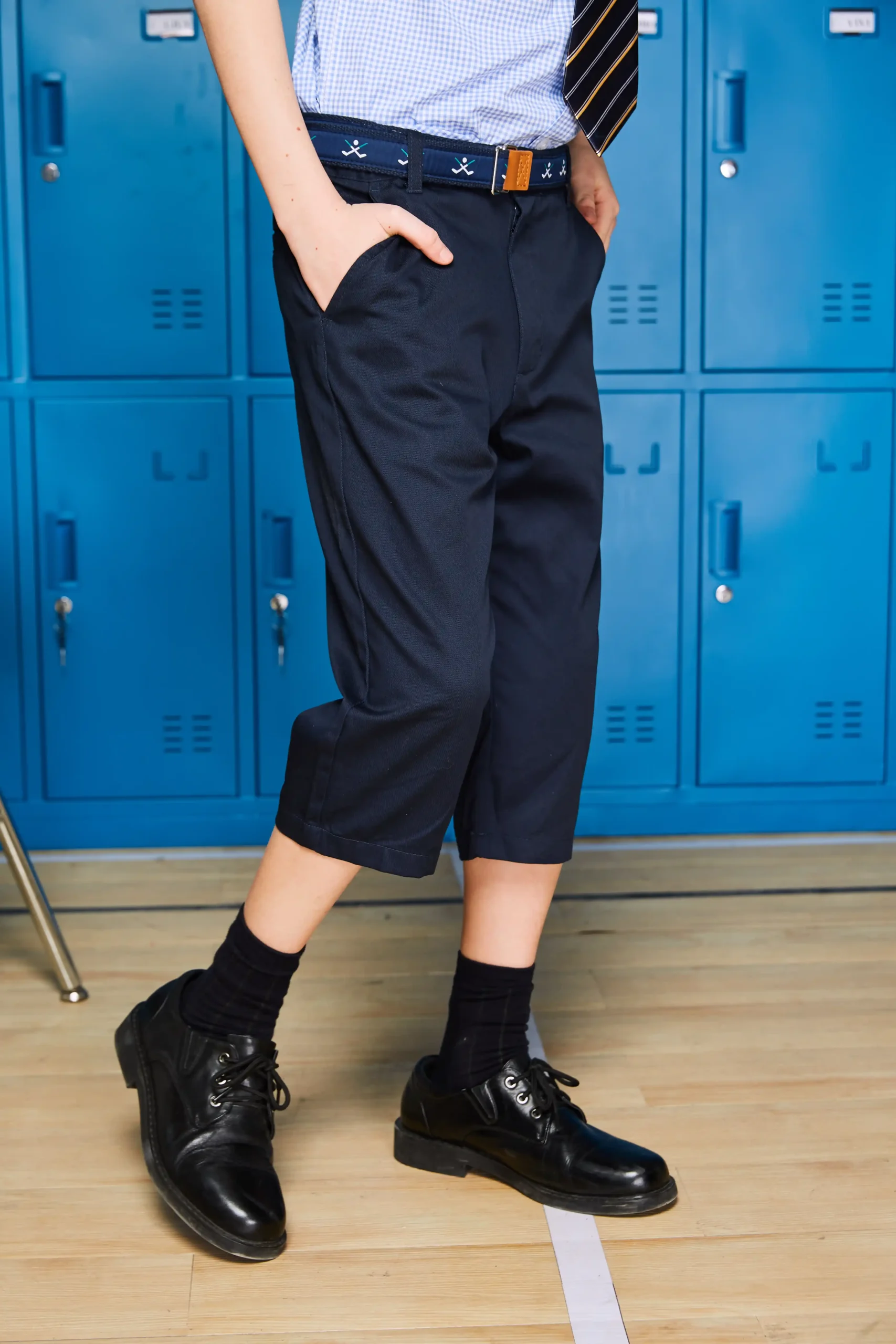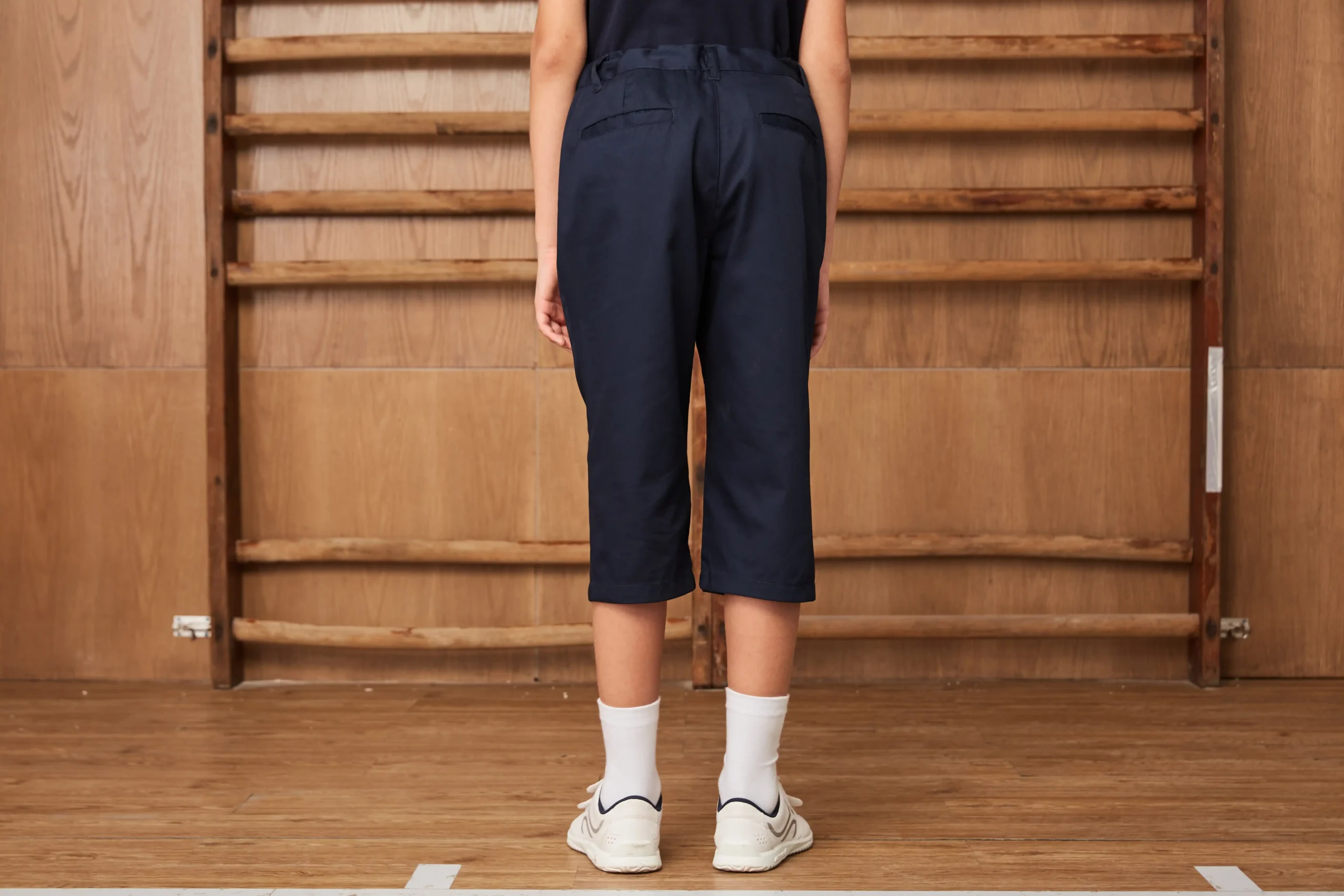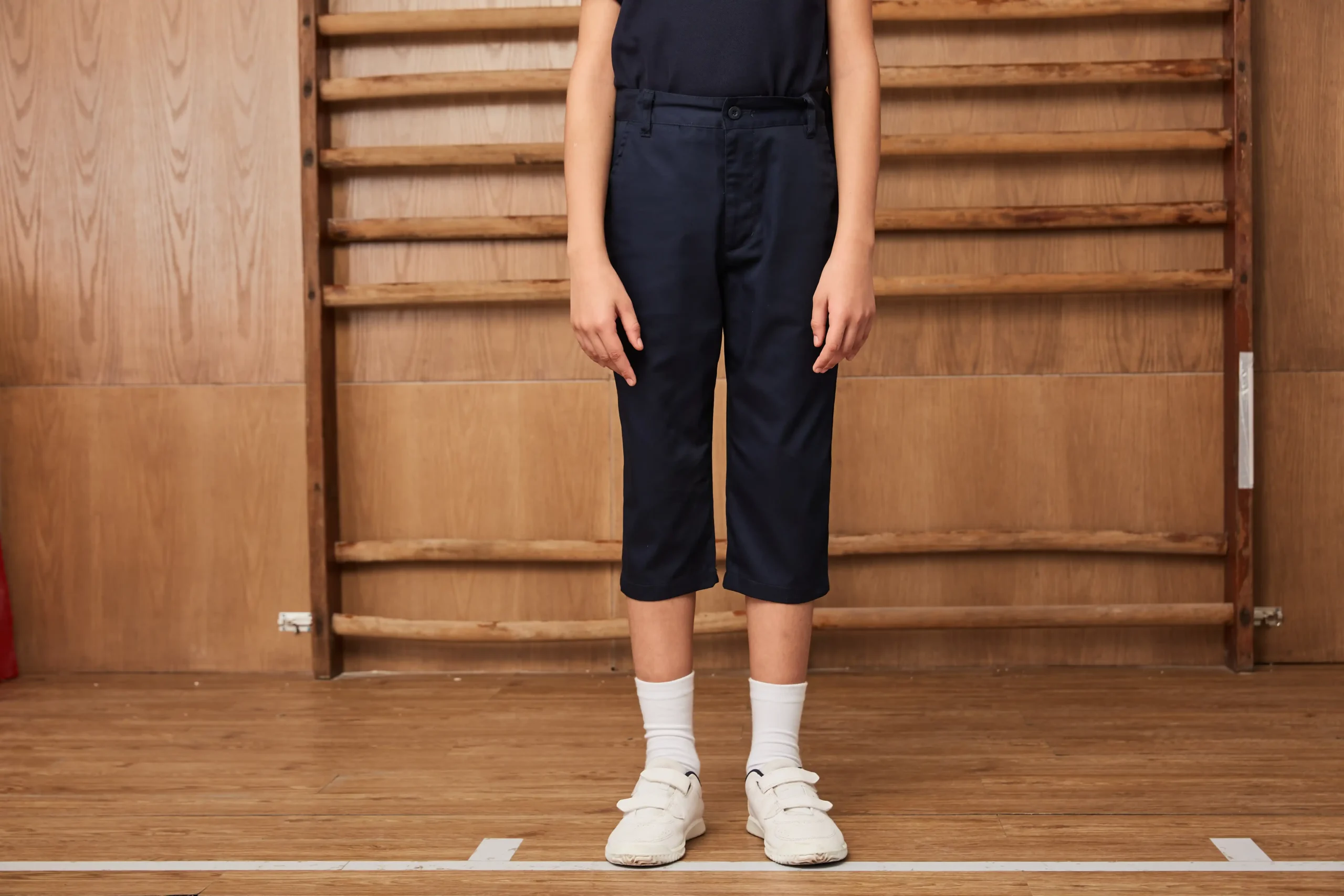These mid-length pants are ideal for a variety of school and casual settings. They pair seamlessly with uniform shirts, polo shirts, or casual tops, providing a polished and cohesive academic appearance. Breathable and lightweight, they allow unrestricted movement during classroom activities, sports, and outdoor play. The practical pocket designs and secure waistband make them suitable for everyday wear, while the bow-back pocket detail adds subtle style. Available in two colors, these pants are easy to mix and match with other school uniforms or casual outfits, offering both functionality and a timeless academic aesthetic.