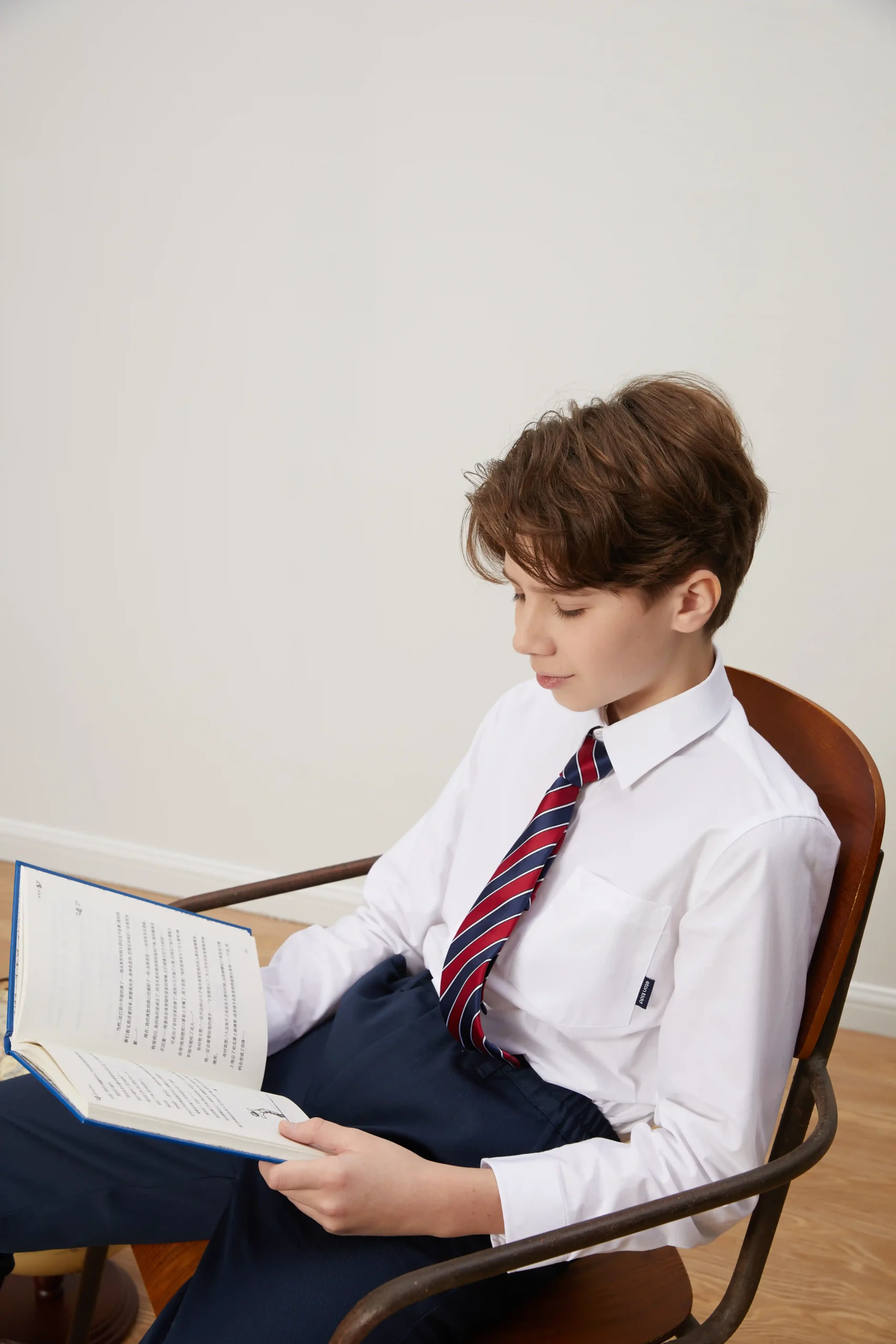 The British Academy Boys’ Wrinkle-Resistant Long-Sleeved Shirt presents a polished blend of refined style and practical functionality. Designed with a preppy small square gentleman collar that holds a crisp, structured shape, it offers enduring sophistication suitable for school or semi-formal wear. Crafted from premium polar white CVC poplin woven with Xinjiang long-staple cotton, the shirt is soft, skin-friendly, and features exceptional whiteness that resists yellowing over time. Its wrinkle-resistant and easy-care qualities reduce maintenance, while functional adjustable cuffs, ergonomic back pleats, and a curved hem ensure both comfort and versatility. Durable reinforcement and custom engraved buttons complete the design, making it a reliable choice for consistent, long-lasting wear.
