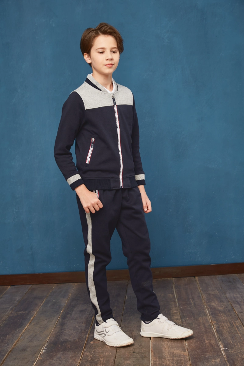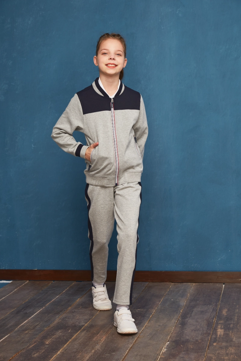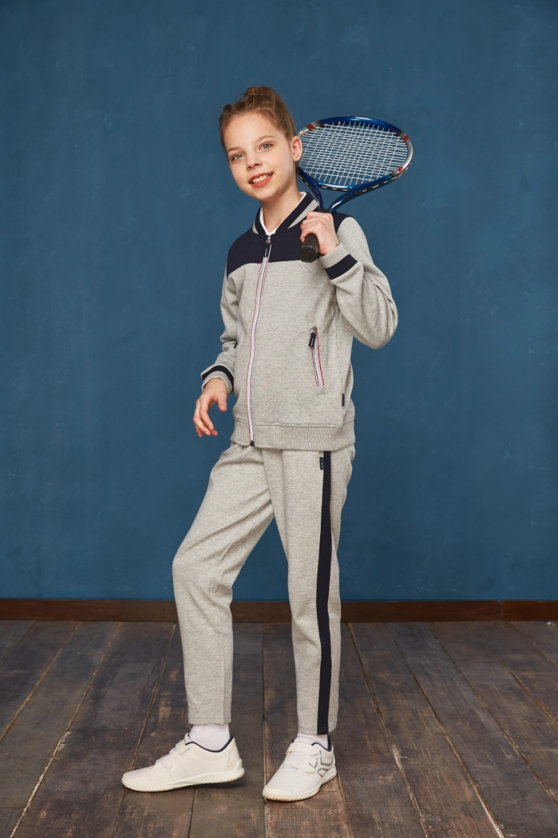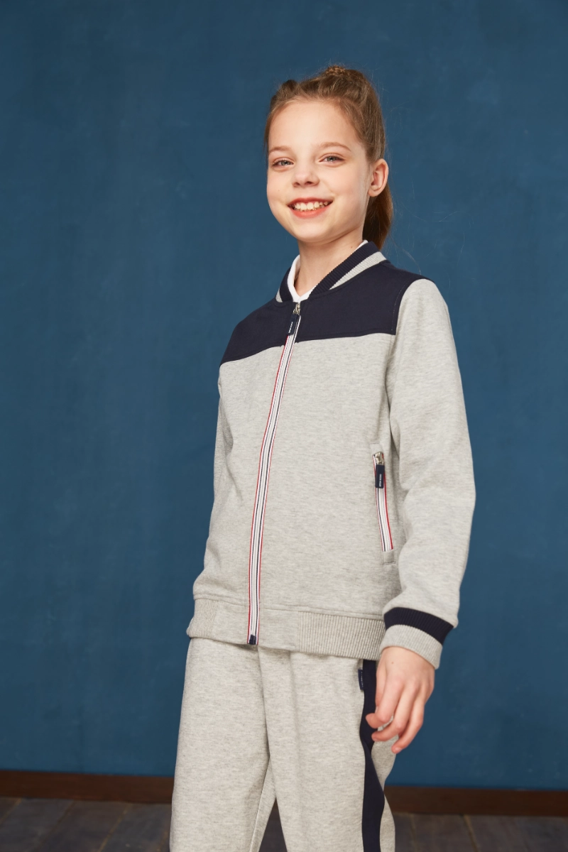 The top features a contrasting ribbed stand collar that adds a touch of preppy sophistication while maintaining a sporty feel. A colorful zipper enhances visual appeal and offers convenient wearability, while symmetrical front pockets provide both functionality and style. The body of the top is rendered in a neutral grey, contrasted with navy sleeves for a dynamic and visually engaging design. The pants feature a drawstring elastic waistband that ensures a secure and adjustable fit, along with multiple practical pockets for storage of small items. Contrasting side stripes add a sporty accent and reinforce the set’s cohesive preppy aesthetic. The double-stitched hems on the pants ensure durability and longevity, while the inclusion of hangtags and care labels reflects the meticulous craftsmanship and attention to detail throughout the set.