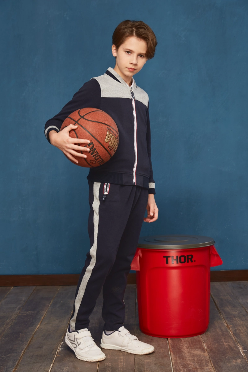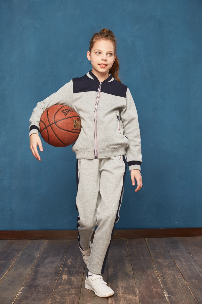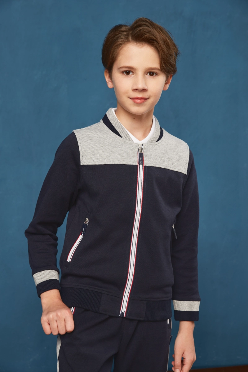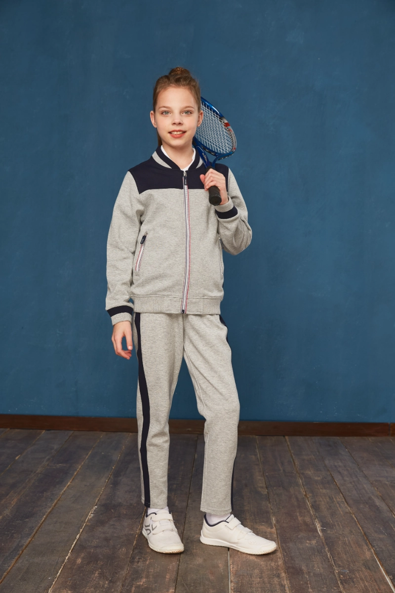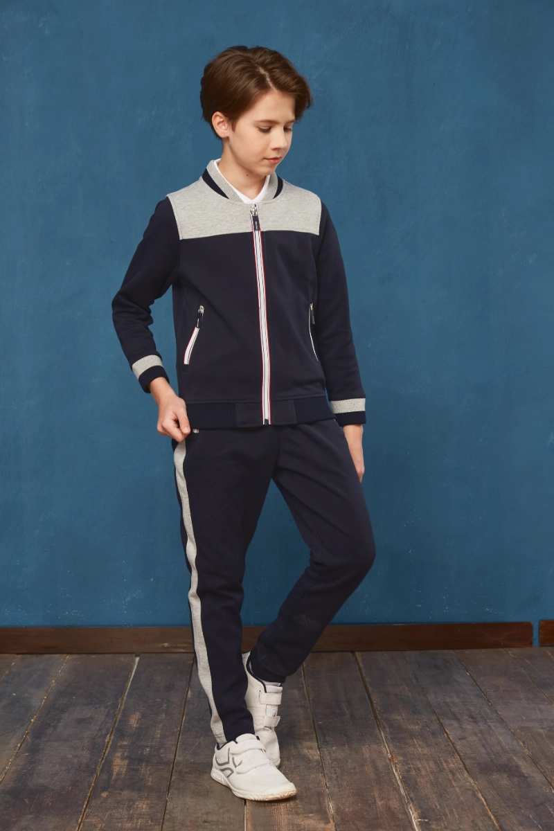 The top features a contrasting ribbed stand collar that adds a touch of preppy sophistication while maintaining a sporty feel. A colorful zipper enhances visual appeal and offers convenient wearability, while symmetrical front pockets provide both functionality and style. The body of the top is rendered in a neutral grey, contrasted with navy sleeves for a dynamic and visually engaging design. The pants feature a drawstring elastic waistband that ensures a secure and adjustable fit, along with multiple practical pockets for storage of small items. Contrasting side stripes add a sporty accent and reinforce the set’s cohesive preppy aesthetic. The double-stitched hems on the pants ensure durability and longevity, while the inclusion of hangtags and care labels reflects the meticulous craftsmanship and attention to detail throughout the set.