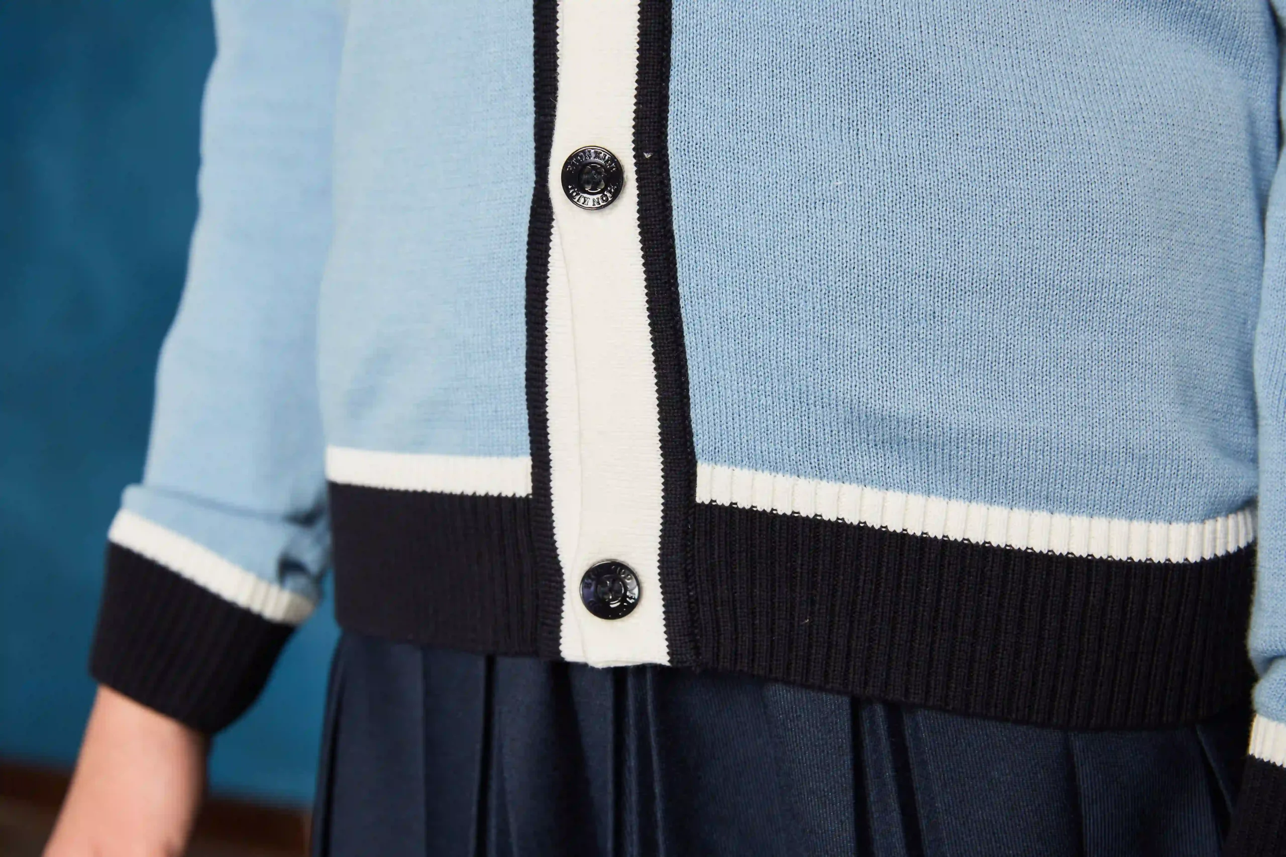 The sweater’s structured silhouette and classic fit make it highly versatile for layering over shirts, blouses, or t-shirts, providing warmth without bulkiness. Its soft, skin-friendly fabric ensures that it can be worn comfortably for long periods, whether attending classes, participating in academic activities, or enjoying casual social engagements. The combination of practical construction, sophisticated aesthetic, and durable materials creates a garment that is suitable for everyday wear while maintaining a polished appearance.