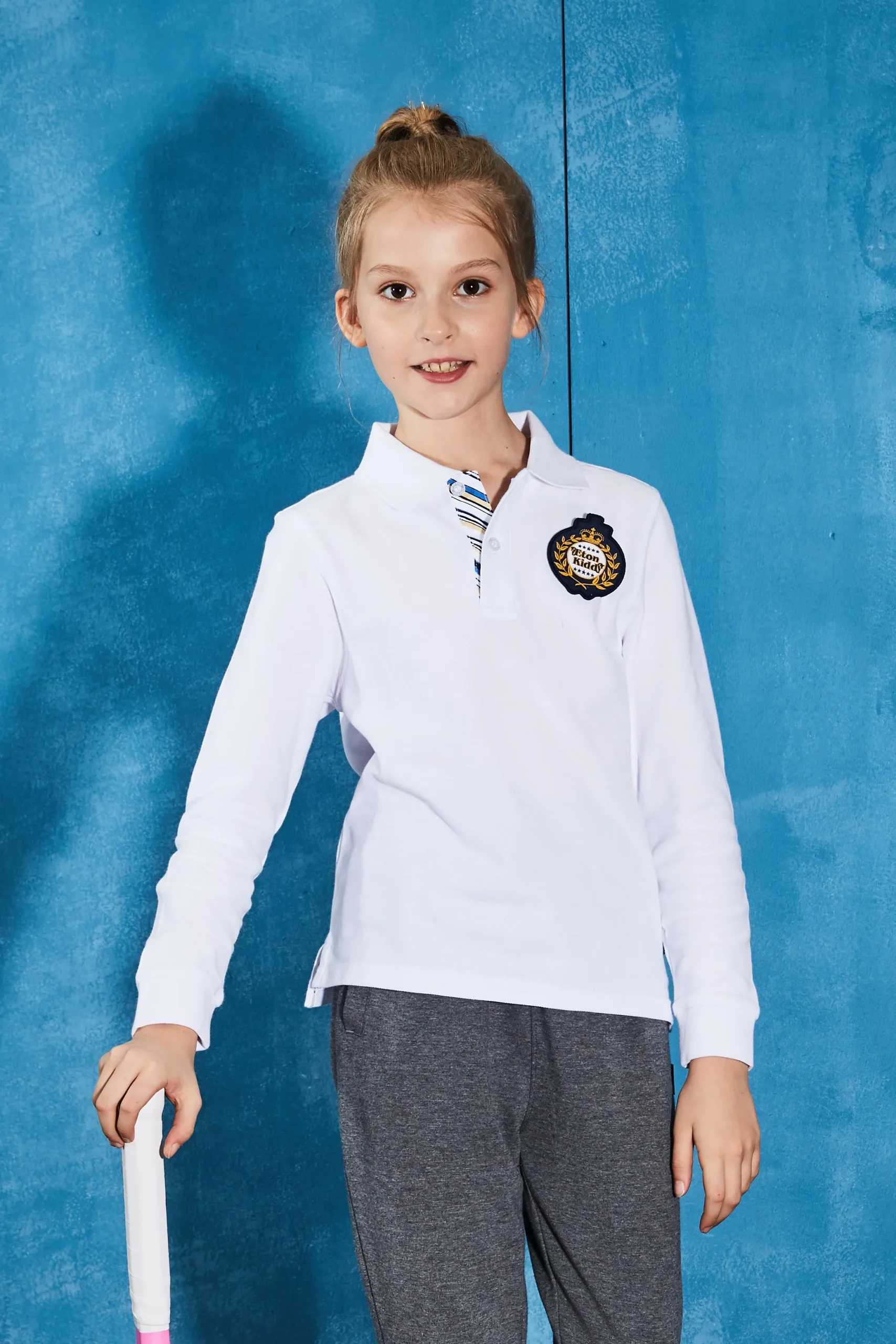 The tee features a ribbed polo collar in classic collegiate style, providing both structure and comfort around the neckline. The contrasting blue-and-white striped placket adds a subtle yet sophisticated visual detail, elevating the overall preppy aesthetic. Side slits at the hem enhance mobility while maintaining the tee’s tailored fit. Ribbed cuffs with moderate elasticity offer a snug yet comfortable fit around the wrists, ensuring the sleeves retain shape without restricting movement. Double-needle shoulder reinforcement adds durability, preventing deformation during wear. The finely stitched hem completes the garment with a polished, high-quality finish. Together, these features ensure a stylish, functional, and enduring long-sleeve tee suitable for everyday wear.