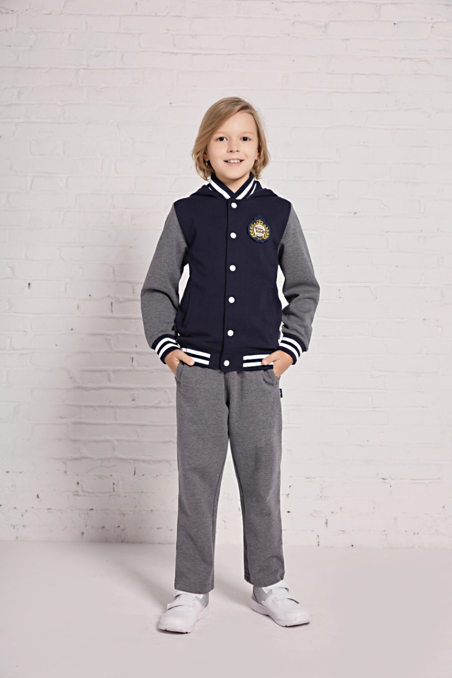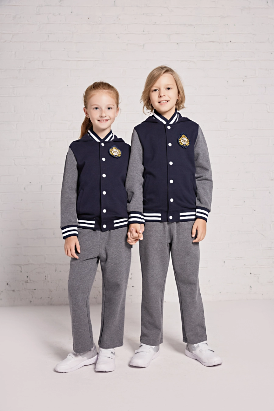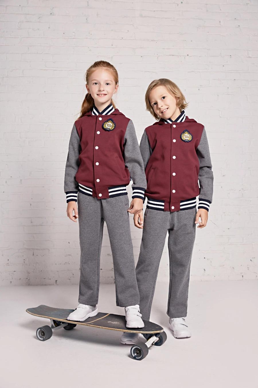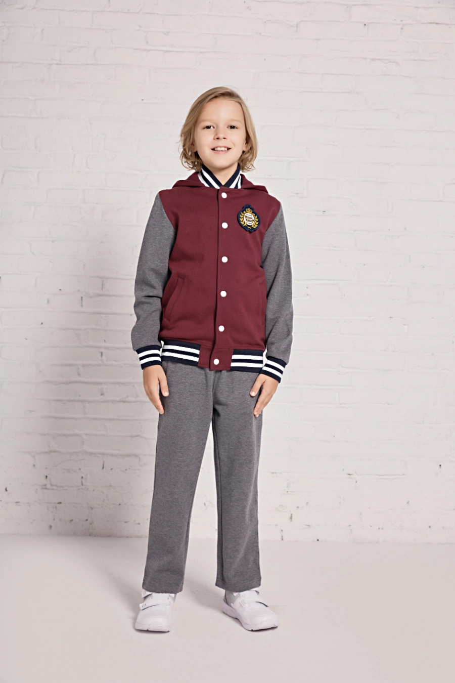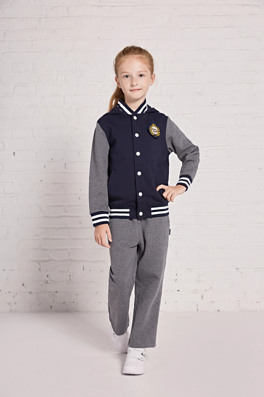 The jacket features a stand-collar design with ribbed detailing for a classic, collegiate-inspired appearance. White snap buttons along the front placket offer easy dressing and add a sporty, modern touch. The jacket is accented with grey sleeves and striped ribbed hem for enhanced visual contrast, while ribbed cuffs ensure a snug fit that retains warmth during outdoor activities. Convenient pockets provide functional storage for small essentials. The pants are designed with a ribbed elastic waistband and adjustable drawstring, offering a secure, customized fit for children of varying shapes and sizes. Together, the jacket and pants create a cohesive, stylish ensemble suitable for active wear. Both garments include a care label and hang tag, reflecting attention to detail and quality standards.