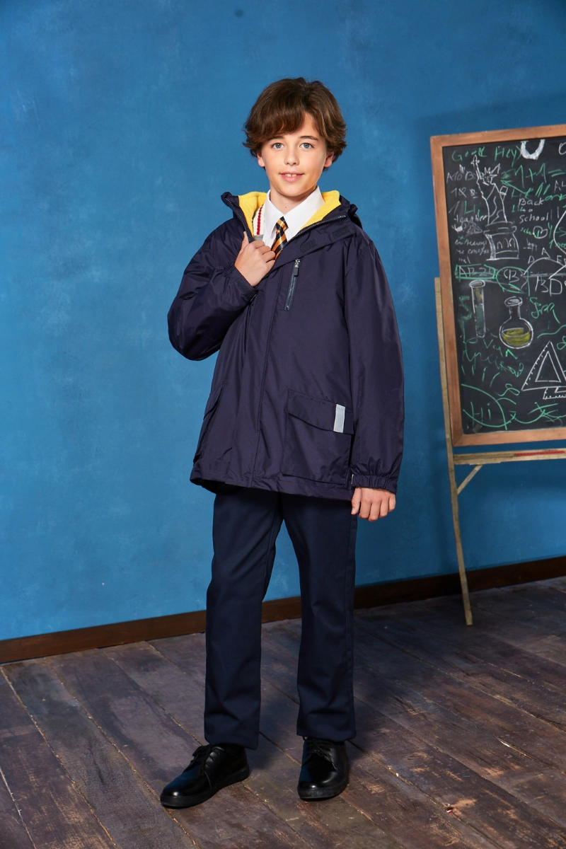 The outer jacket includes a detachable 3-in-1 system for maximum versatility, allowing children to adapt their jacket according to changing temperatures or activity levels. Safety reflective strips are incorporated along key areas for enhanced visibility during early morning or evening activities. The removable hood provides extra protection against wind and light rain while maintaining breathability thanks to a mesh lining. Symmetrical patch pockets with flaps and a zippered chest pocket provide convenient storage for small items, while adjustable sleeve cuffs help maintain warmth and prevent drafts. The inner fleece vest features a stand-up collar for added comfort, elastic windproof cuffs, and a front zipper closure, allowing it to be worn independently or layered with the outer shell. Both pieces include a care label and hang tag for easy maintenance and brand recognition.