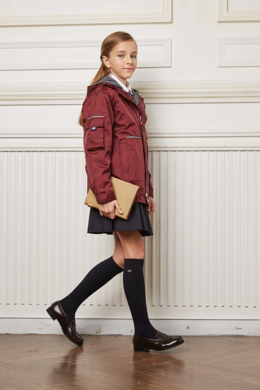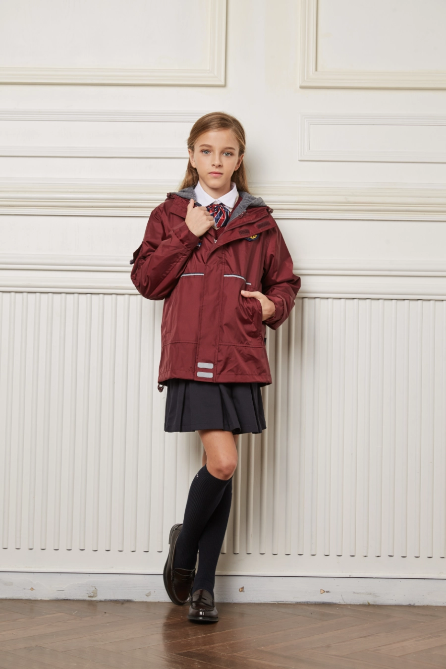 The outer jacket incorporates a 3-in-1 multi-functional system that accommodates a wide range of temperatures and occasions. Lightweight, windproof, and water-resistant, the hood adds extra protection against harsh weather while maintaining breathability. High-quality smooth zippers allow easy wear and removal, and dual side pockets provide practical storage for small items. Adjustable cuffs ensure a secure fit, and a class name label prevents mix-ups in school or group activities. The breathable mesh lining maintains comfort during extended wear, while the sleeve pocket design offers additional convenience. The inner fleece vest features a hooded zip-up design, elastic windproof cuffs, and embedded reflective piping for enhanced visibility. It can be worn independently or layered with the outer shell for maximum warmth. Front pockets and sleeve loop fasteners further enhance functionality and practicality for children on the move.