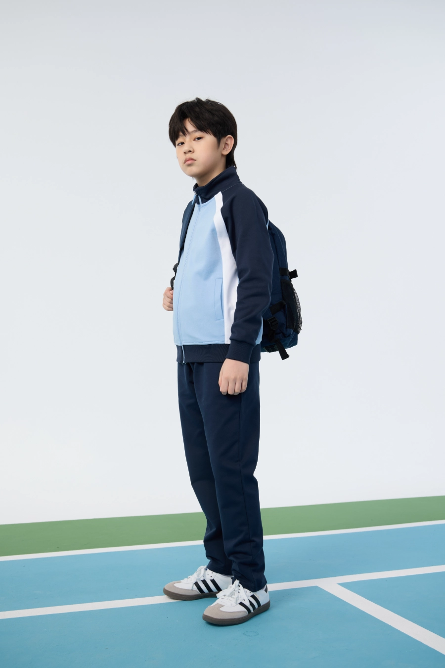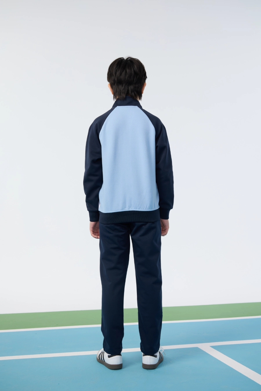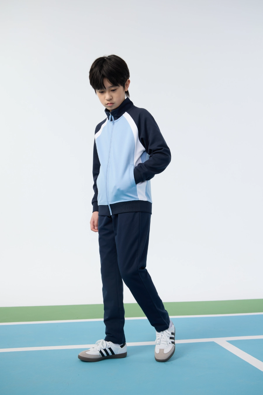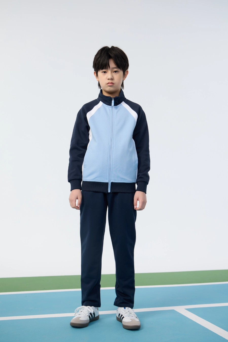 The top features a stand collar design, providing additional neck coverage and a refined collegiate look. The reversed front zipper allows for easy wear and removal while maintaining a sleek appearance. Curved contrast color blocking adds visual interest and emphasizes the sporty aesthetic of the design, while symmetrical side pockets provide practical storage for small essentials. Ribbed cuffs fit snugly around the wrists to retain warmth and ensure comfort, and the windproof ribbed hem provides protection against drafts while maintaining the garment’s shape during active movements. Every design element is purposefully integrated to enhance both functionality and style, making this top a reliable choice for active children who value performance and visual appeal.